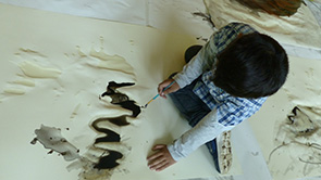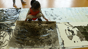 En plus nous avons un groupe d'invités exceptionnels. Nous avons entamé un dialogue avec un groupe d'enfants de l'école maternelle du Centre qui s 'est spontanément approchée pour visiter mon exposition d'ouverture , grâce aux affiches à l'encre de chine qu' elle avait vues dans la ville. Après la visite, ils ont entamé tout un travail du noir, que j'ai trouvé très intéressant et qui fera partie aussi de l'exposition.